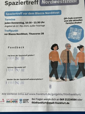 Der kostenfreie Spaziertreff „Fit in Frankfurt“ in der Nordweststadt bietet wöchentlich donnerstags um 10:30 Uhr gemeinsame Spaziergänge am Biazza im Nordwestzentrum an. Ohne Anmeldung können Interessierte rund eine Stunde in der Gruppe gehen, soziale Kontakte knüpfen und leichte Bewegungsübungen machen.
