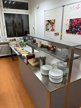 Unsere Brotzeit-Tafel und davor ist unser Buffet. Mit zwei Teesorten, Wasser und Milch