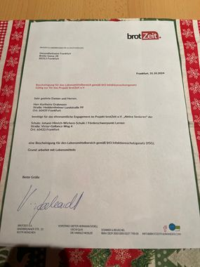 Ich wollte das nicht für mich akzeptieren und dann las ich in einer Anzeige, daß man einen brotZeit Frühstückshelfer an der Johann-Hinrich-Wichern Schule, Förderschule in Eschersheim suchte, bzw. ein ganz neues Team. Ich bewarb mich und konnte im November 2024 mit dem neuen lieben Team anfangen. Einiges musste man beachten: Bescheinigung vom Gesundheitsamt Frankfurt
