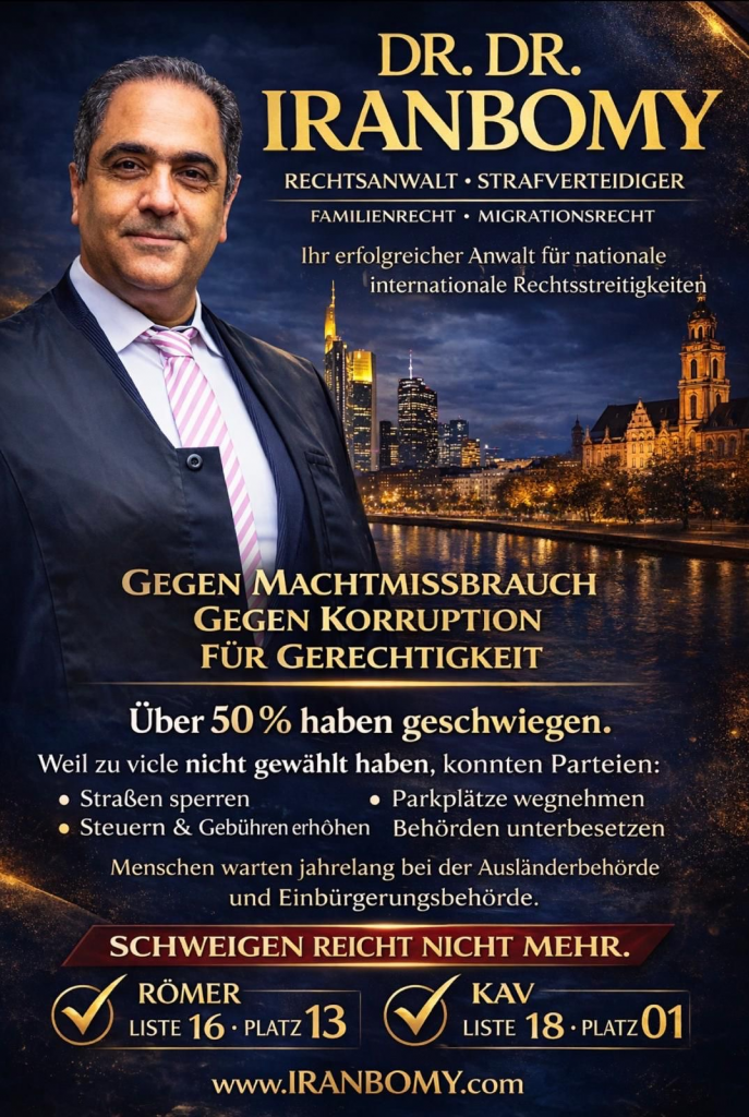Die FREIE WÄHLER, Frankfurt haben aus meiner Sicht den kompetentesten Kandidaten mit Dr. phil. Dr. jur. Sharom Iranbomy für die KAV Wahl aufgestellt. https://frankfurt.de/service-und-rathaus/verwaltung/aemter-und-institutionen/geschaeftsstelle-der-kav/die-kav/mitglieder-der-kav/dr-dr-shahram-iranbomy Er leistet schon seit vielen Jahren, vielfältigste Aufgaben für die Stadt der Vielfalt.