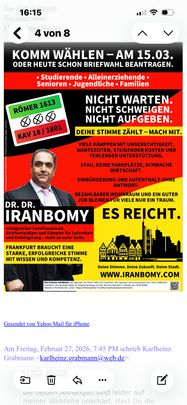 Der Krieg im Iran hat einiges in der Welt verändert. Die Sichtweisen sind sehr unterschiedlich in der Beurteilung der Lage, ob in der Ukraine, Iran oder wo anders. Kriege sind für mich nicht akzeptabel. Für mich zählt nur Frieden unter allen Völkern der Welt. Beim Austragen meiner 5.000 Flyer habe ich die enorme Veränderung in der Stadt Frankfurt nach Herkunftsländer gesehen. Man macht sich da schon seine Gedanken, wie kann das alles funktionieren Arbeit, Erziehung, Kita, Schule, ältere Menschen…